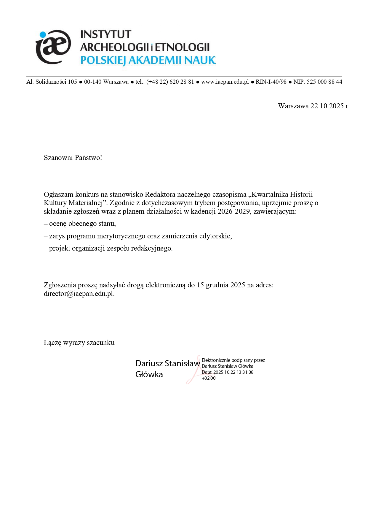 Konkurs na Redaktora naczelnego “Kwartalnika Historii Kultury Materialnej”