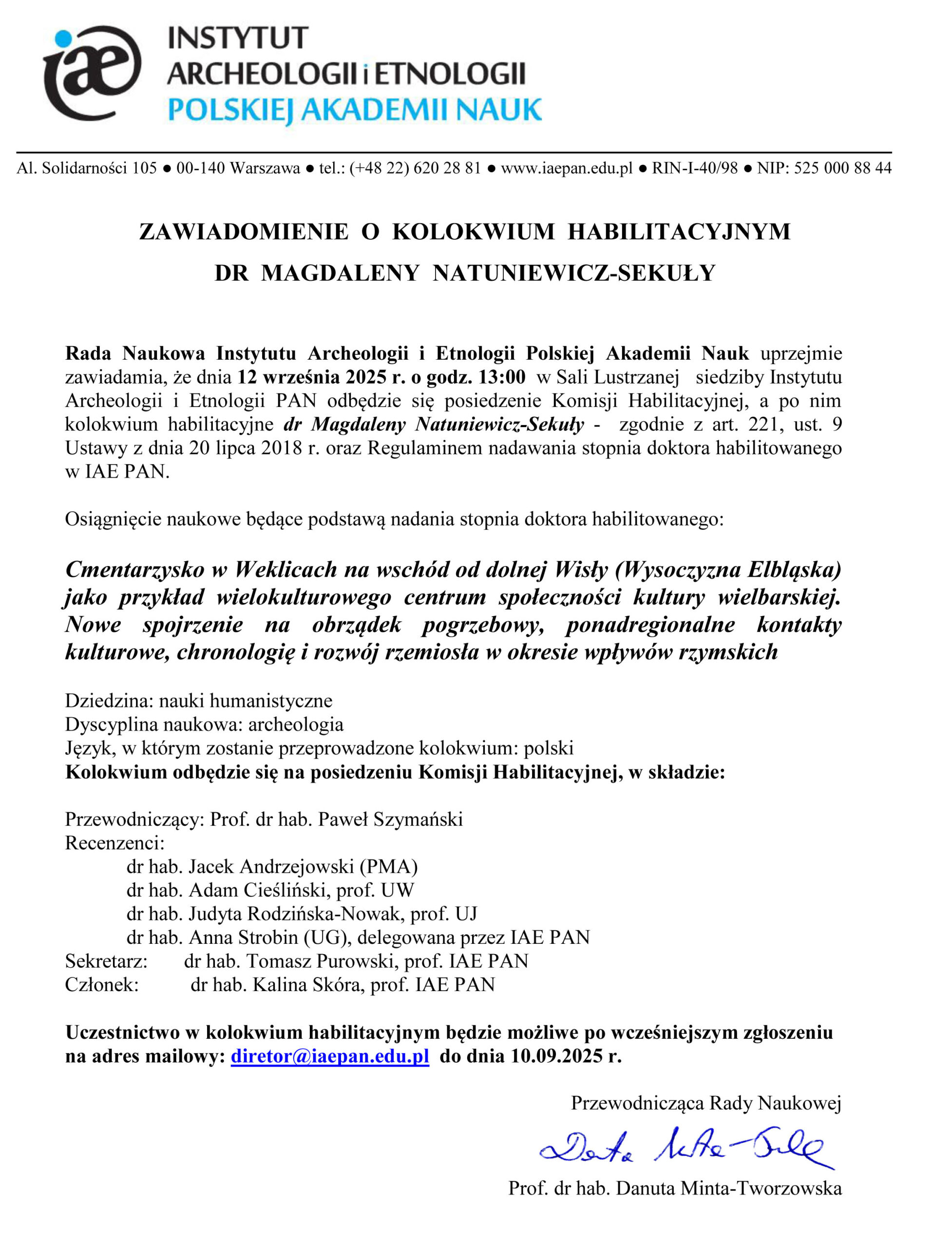 Zawiadomienie o kolokwium habilitacyjnym dr Magdaleny Natuniewicz-Sekuły