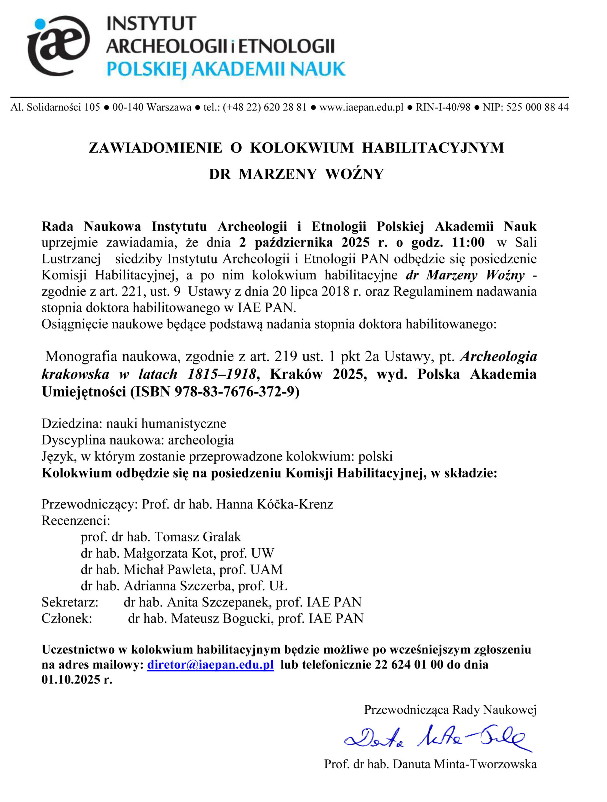 Zawiadomienie o kolokwium habilitacyjnym dr Marzeny Woźny